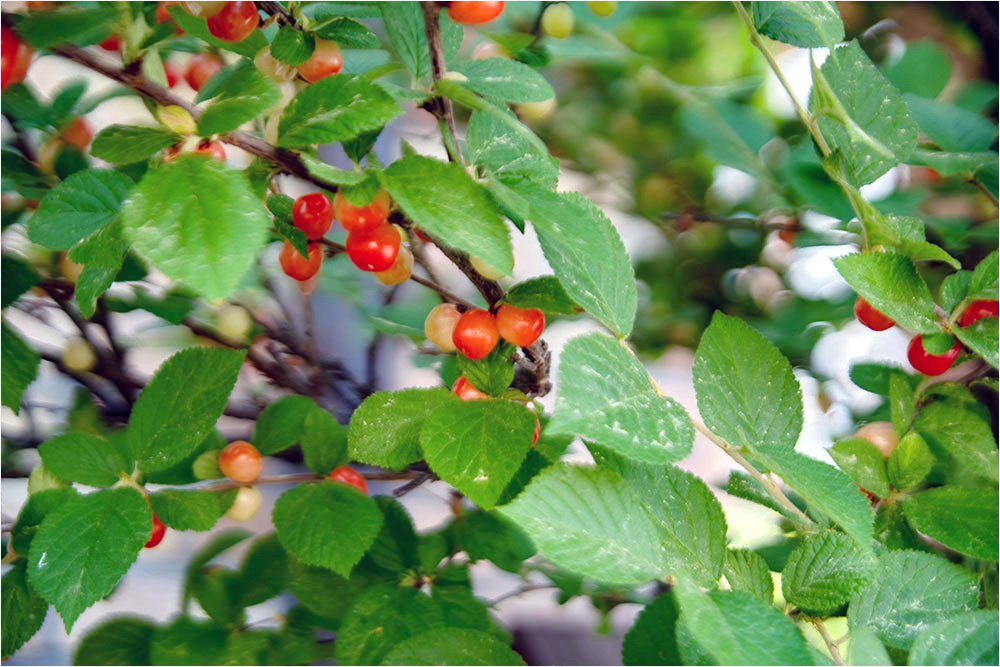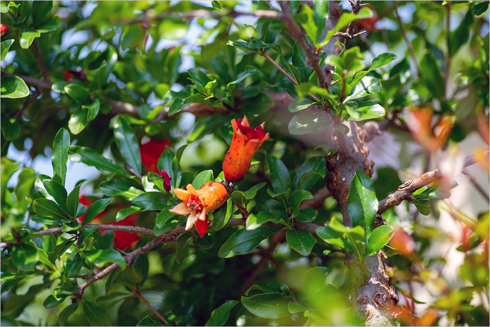 우리 동네에서 찍은 앵두는 다 익었다. 그 옆에 서 있는 석류는 병충해를 입어 열매 표면에 벌레가 새카맣게 붙어 있었다. 부득이 가마골 근처 농원의 대문간에 벋어 있는 석류를 찍었다. 석류는 아직 꽃이 많고, 꽃에서 열매로 옮아가는 중이다.