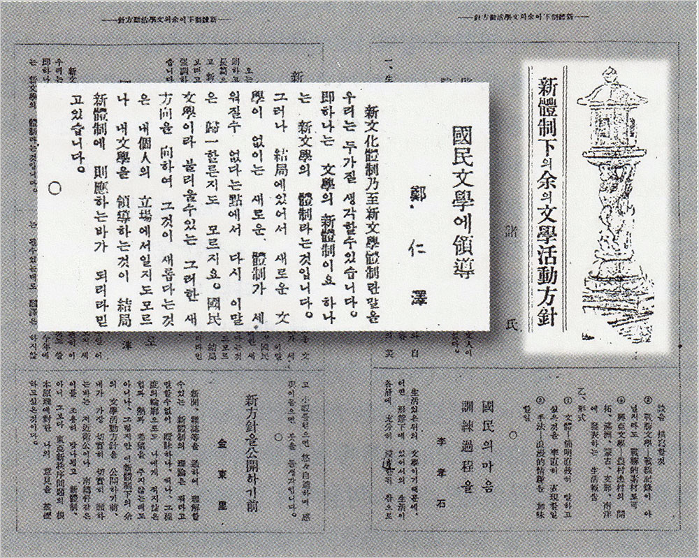 『삼천리』 1941년 1월호에 발표한 「국민문학에 영도(領導)」를 통해 그는 일제에 봉사하는 ‘국민문학’의 방향을 분명하게 정의하였다. 「엄숙한 의무」에서는 ‘불타는 국민적인 것에의 열정’을 억제할 길이 없다고 흥분하면서, 그는 이러한 열정은 ‘황민적인 자각’에서 비롯되며 그것은 의도적인 노력이 있을 때 가능하다고 주장하였다.