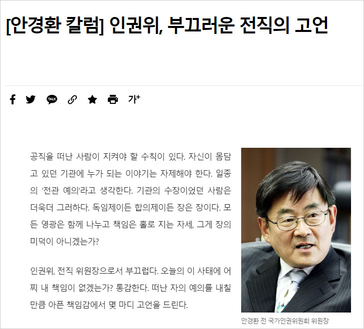 그는 인권위의 징계에 관해 말하면서 직원들의 1인 시위가 “그들의 행위가 바람직한 일이 아닐지 모른다. 그러나 모두가 헌법이 보장하는 행위”이며, “인권위가 다른 기관에 대고 권고하던 바로 그 내용들”이라고 정리한다. 그리고 묻는다. “단 반걸음이라도 앞서 세상을 이끌어야 할 인권위가 스스로 뒷걸음을 치겠다면 국민이 어떻게 생각할까. 도대체 왜 인권위가 필요한가 라고 묻지나 않을까?”