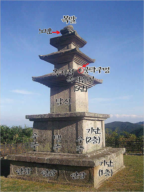 아래층 기단의 네 면에는 3구씩의 안상(眼象 : 사람의 눈처럼 새긴 모양)을 조각하였고, 위층 기단은 각 면의 모서리와 가운데에 기둥 모양의 조각[우주(隅柱 : 모서리 기둥)와 탱주(撑柱 : 안 기둥)]을 두었다. 탑신은 몸돌 모서리마다 기둥 모양을 새겼다. 옥개석(屋蓋石:지붕돌)은 밑면의 받침이 5단이며, 네 귀퉁이가 위로 들려 있다. 모서리에는 모두 풍경구멍을 내어놓았는데 이는 풍탁(風鐸), 또는 풍경(風磬) 등의 장식을 매달거나 부착하기 위함이다.