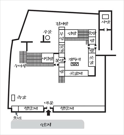 오른쪽에 안채, 왼쪽에 사랑채가 배치되어 있고, 앞쪽에 행랑채가 있다. 사랑채는 ‘T’자형을 하고 있는데 왼쪽 끝에 누마루를 두고 있다. 이 누마루를 ‘운조루’라 부른다. 안채 쪽에 사랑채와 직각을 이룬 작은 사랑채가 있다. 안채는 ‘ㅁ’자형을 하고 있는데 규모가 상당히 큰 편이다. 가운데 대청마루를 중심으로 크고 작은 방과 부엌, 광 등이 배치되어 있다. 안채 오른쪽에는 불천위(不遷位) 조상을 모신 사당을 두었다.