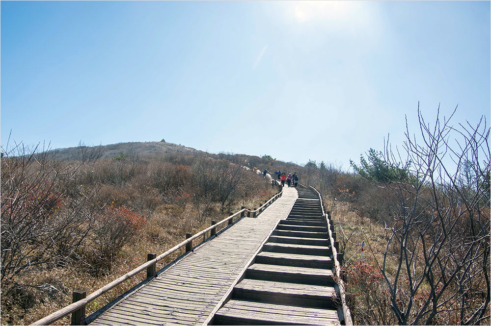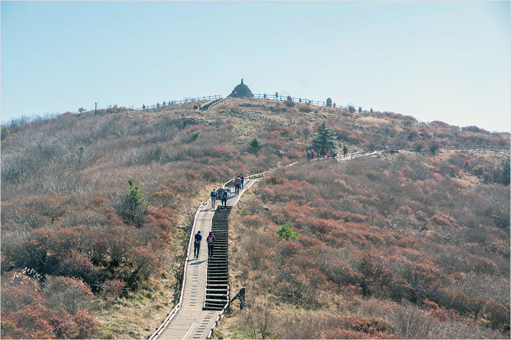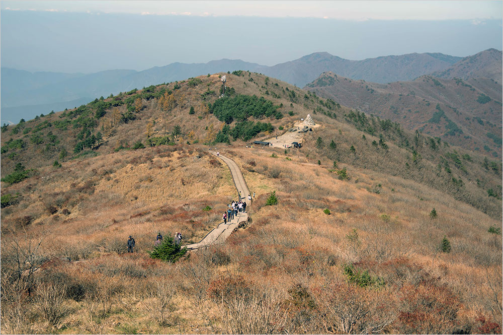 저만치 보이는데도 노고단 정상(1507m)까지의 거리는 좀처럼 줄지 않았다. 정상을 향해 휘돌아가는 데크 길에는 노고단에 오르는 갖가지 차림의 남녀노소 탐방객들이 점점이 흩어져 있었다. 바람이 거세졌지만, 아직 춥다고 느껴지지는 않았다.