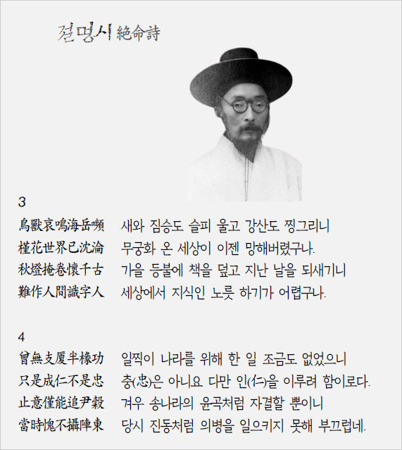 조선왕조가 아니 대한제국이 왕의 나라라면 마땅히 망국의 책임과 죄업은 임금과 그 일가가 져야 한다. 그러나 이씨 성의 왕족 가운데 스스로 책임을 다한 이는 아무도 없었다. ‘사직을 위해 죽어야 할 의리’가 없는 매천이 죽음으로써 그 부끄러움을 대신했을 뿐이다.
