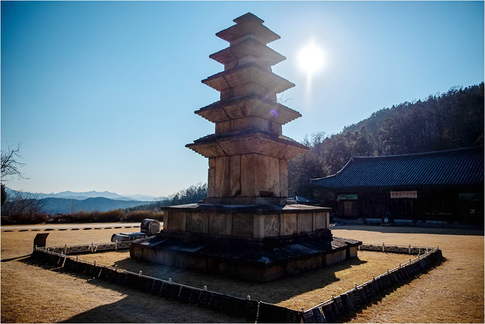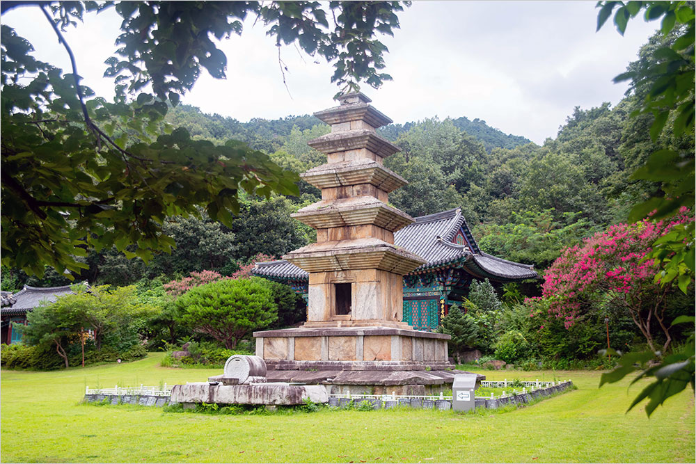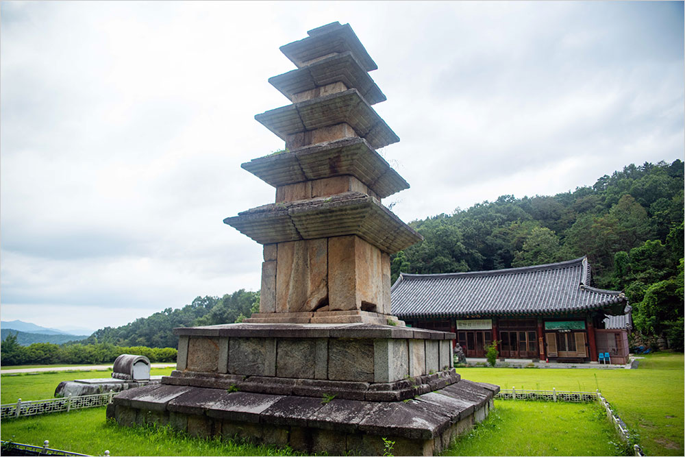 탑은 대웅전을 등지고 앞뜰의 중앙에서 약간 오른쪽으로 치우쳐 마당 끝 산비탈 옆에 서 있다. 동서남북 어느 쪽에서 바라보아도 탑은 의연한 기품을 잃지 않으며 주변 풍경에 살갑게 녹아 있다. 10m에 이르는 높은 탑인데도 편안한 안정감을 보임은 상하층 기단이 워낙 나지막한 데다가 각 층의 체감률이 비례에 맞아서다.