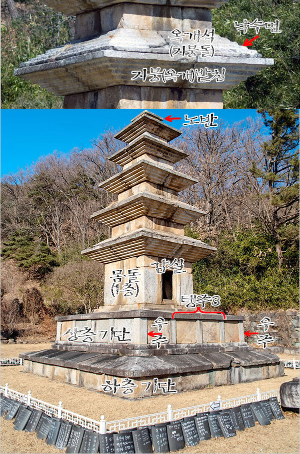 몸돌에는 없는 기둥 조각이 상층 기단에는 각 면에 세 개의 탱주(撐柱:안 기둥)와 두 개의 우주(隅柱:모서리 기둥)가 있다. 이 기둥 조각은 여느 탑처럼 새겨서 표현한 것이 아니라 판석(板石)과 결합하여 나타내고 있는 점이 특이하다. 이는 1968년 조사와 함께 국보로 지정된 후 1972년 6월 해체 복원할 때, 새 부재로 보완한 것이다.