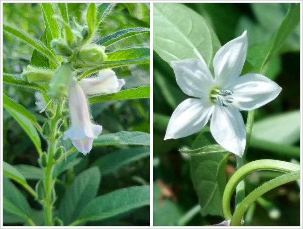 폭우가 지나간 밭 주위는 발이 빠지긴 했지만, 비를 맞은 갖가지 작물들이 시나브로 싱싱하게 살아나고 있었다. 모녀가 고추를 따는 동안, 나는 한량처럼 하우스 안팎을 어슬렁거리면서 사진을 찍었다. 새삼 땅을 향해 수줍게 고개를 떨군 하얀 참깨꽃과 고추꽃을 여러 장 담았다.