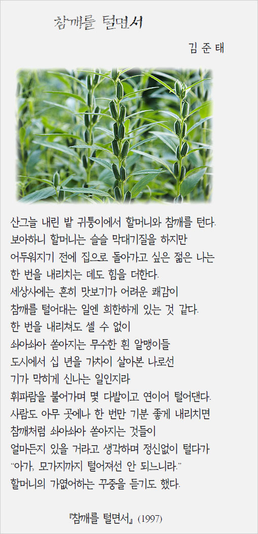 세상에 아름답지 않은 꽃은 없다고 생각한다. 벌과 나비가 꾀지 않는 꽃은 없으니, 풀꽃들이 개체를 유지해 가는 저 자연의 순환은 참으로 위대하지 않은가. 김준태 시인은, 모든 일은 밟아야 할 순서가 있으며, 인내와 기다림이 있어야 한다는 평범한 진리를 할머니에게서 배우고 있음을 시 ‘참깨를 털면서’에서 노래했다.