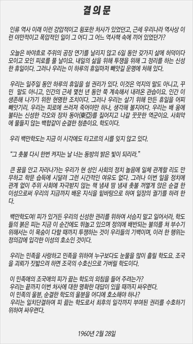 “백만 학도여, 피가 있거든 우리의 신성한 권리를 위하여 서슴지 말고 일어서라. 학도들의 붉은 피가 지금 이 순간에도 뛰놀고 있으며, 정의에 배반되는 불의를 쳐부수기 위해 이 목숨 다할 때까지 투쟁하는 것이 우리의 기백이며, 정의감에 입각한 이성의 호소인 것이다.”
