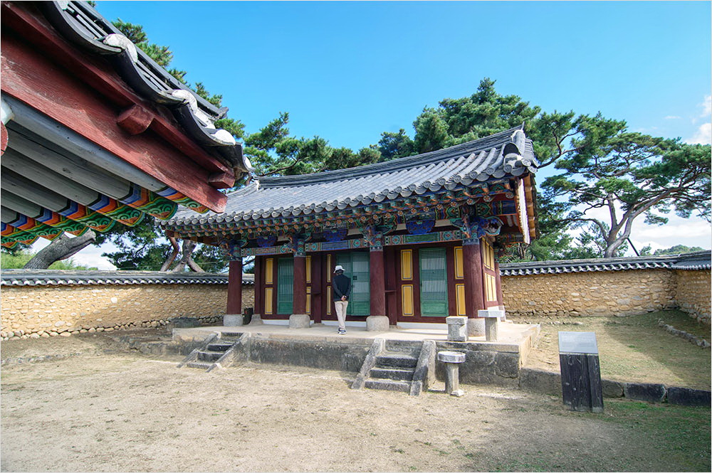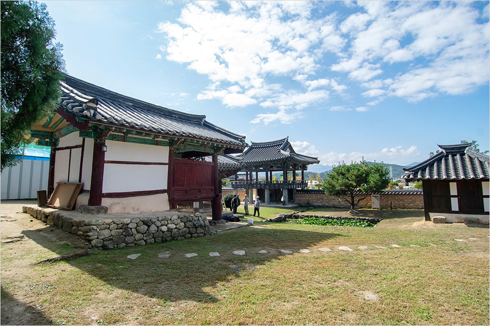 사당과 서원의 담장 너머에는 잘 자란 노송이 푸른 잎을 드리우고 서 있었다. 푸른 가을 하늘을 배경으로 기품 있게 자란 소나무가 썩 잘 어울렸다. 우리는 명성당 대청마루에 걸터앉아 사진 한 장을 박았고, 이런저런 이야기를 주고받았다. 서원은 크지는 않았지만, 아담하고 잘 정돈된 듯한 균형감이 있었다. 보수 공사 중이어서 완전한 모습을 렌즈에 담지 못해나는 못내 아쉬웠다.