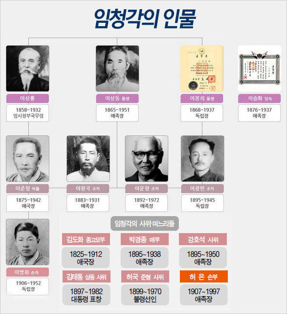 그러나 이뿐이 아니다. 임청각의 사위들 역시 독립투사였다. 조선 말기의 학자로 1895년 을미사변과 단발령에 항거하여 안동군내 유림대표로 의병장에 추대된 김도화(애국장) 선생은 석주의 종고모부였다. 석주와 함께 만주로 망명하여 이주 동포들의 정착을 도왔던 영덕 사람 박경종(애족장)은 그의 매부였다.