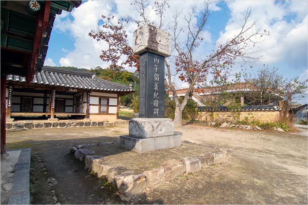 강수재 앞에 우뚝 선 빗돌은 80여 명의 선비들이 항일 의병에 뜻을 모은 기록 ‘병오창의기적비’다. 1905년 일본의 강요로 을사늑약이 체결되자 이듬해 1906(병오)년 6월 최익현(1833~1906)과 임병찬(1851~1916)의 주도로 무성서원에서 ‘호남 최초의 의병’을 일으킨 것이다. 최익현은 청토오적소(請討五賊疏)를 올려 조약의 부당함을 부르짖으며 거병하였으나 체포되어 대마도로 유배되었다가 순국하였다. 1992년, 무성서원에서 호남 최초로 의병이 일어난 역사적 현장을 기억하고자 이 빗돌을 세웠다.