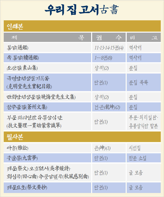 서가에서 꺼낸 책의 목록은 다음과 같다. 목판 인쇄본으로 보이는 책이 7종 20권, 필사본이 4종 4권이다. <통감> 같은 책이야 이미 잘 알려진 바 있지만, 개인 문집이나, 현대에 들어 간행된 책은 인터넷에서도 관련 정보를 찾기 어려웠다. 확인한 고서의 내용을 간단히 소개한다.