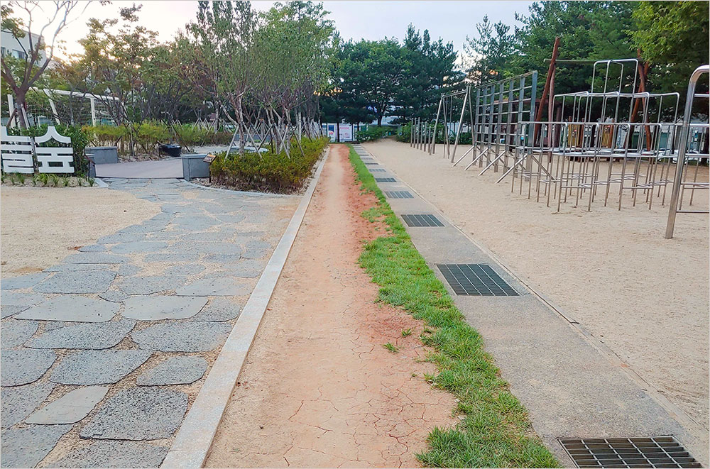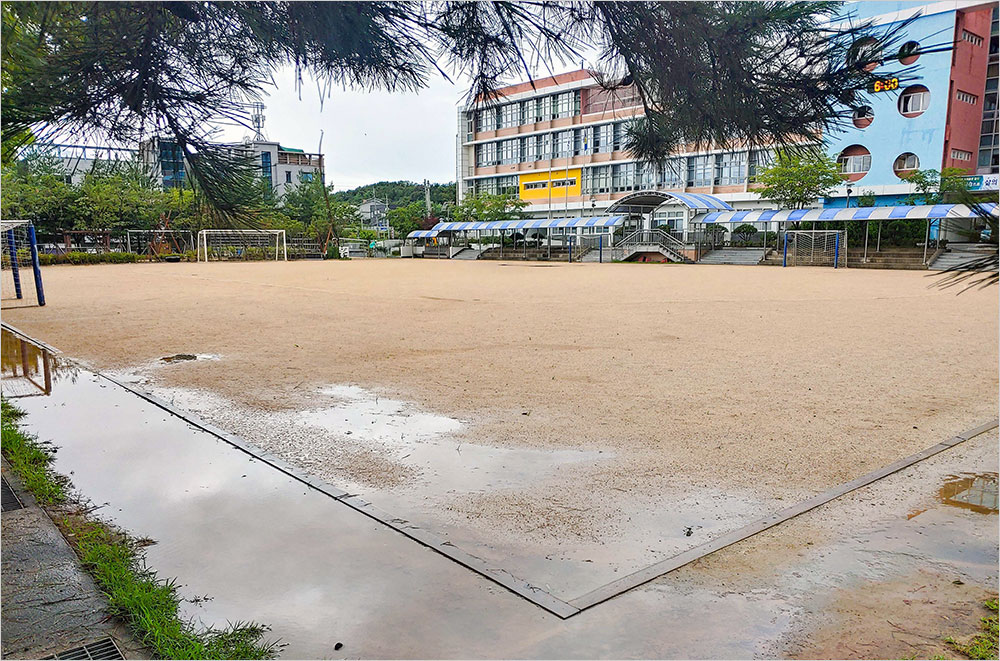 나는 별 의심 없이 ‘맨발 걷기나 한번 해 볼까’ 하고 생각했고, 이틀 후 가맛골에 갔다가 돌아오는 길에 30분쯤 운동장 트랙(일반 육상 트랙이 아니라, 운동장 가장자리에 1.5미터 폭으로 조성해 놓은 직사각형의 맨발 걷기장)을 돌았다. 맨발 걷기장은 교사(校舍) 쪽과 교문 쪽은 모래땅 그대로되, 그 반대쪽인 학교 담장 쪽의 두 변엔 황토를 깔아놓은 길이었다.