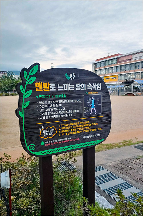 보름 전쯤, 아내와 함께 아침 운동을 다녀오는 길, 동네의 초등학교 옆을 지날 때였다. 운동장 안에 트랙을 도는 사람들이 꽤 많았는데, 이들은 반쯤은 맨발이었다. 교문 안쪽으로 들어서니 운동장 가녘에 “맨발로 느끼는 땅의 속삭임”이라는 제목 아래 ‘맨발 걷기의 이로운 점’, ‘맨발 걷기장 이용 방법’ 따위가 적힌 안내판이 서 있었다.
