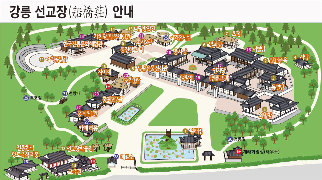 선교장(船橋莊)은 예전엔 집 앞이 경포호수였으므로 배로 다리를 만들어 호수를 건너다녔다. 이 유서 깊은 전통가옥에 ‘배다리[선교(船橋)]’라는 이름이 붙은 까닭이다. 선교장은 효령대군의 11대손인 이내번(1703~1781)이 건립한 조선 후기의 전형적인 상류 주택이다.