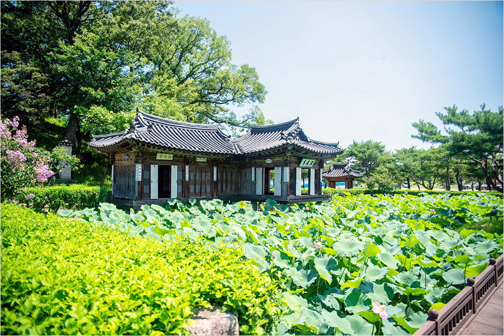 매표소를 지나 선교장 내부로 들어서면 바로 오른쪽에 네모 난 인공 연못과 정자 하나가 방문객을 맞는다. 검푸른 연잎이 덩실대는 연못 한가운데 섬에는 소나무 몇 그루, 건너편의 정자가 선교장에 딸린 외별당(外別堂) 활래정(活來亭)이다.