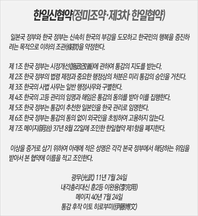 1907년 7월 24일 대한제국 내각총리대신 이완용(1856~1926)과 조선 통감 이토 히로부미(伊藤博文, 1841~1909)는 통감 관저에서 ‘한일신협약’을 체결했다. 전체 7개 항목의 이 조약으로 일제는 대한제국 정부의 시정을 개선한다는 명목하에 법령의 제정과 중요 행정상의 처분 등 모든 사무에 대해 승인권을 장악했다. 이로써 대한제국 정부는 입법·사법과 고등 관리의 임면 등 대한제국 주권인 입법·행정권을 고스란히 빼앗긴 것이었다.