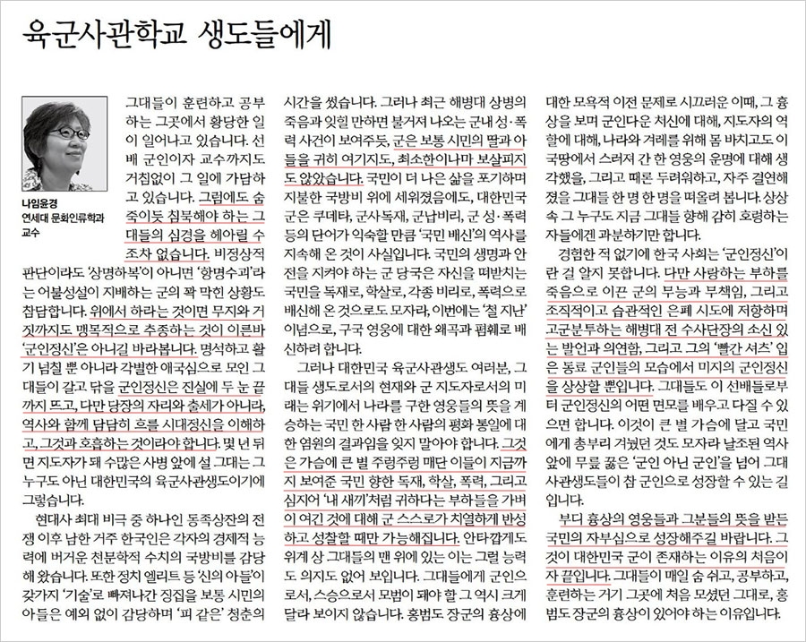 나임윤경 교수의 글은 ‘왜냐면’의 성격상 자진해 ‘기고’한 글로 보인다. 아마, 나 교수는 최근에 벌어진 군의 이른바 ‘항명’ 사건과 ‘독립 영웅 흉상 철거’ 등의 문제와 관련해서 육사 생도들에게 무언가를 말하여야겠다고 생각한 듯하다.