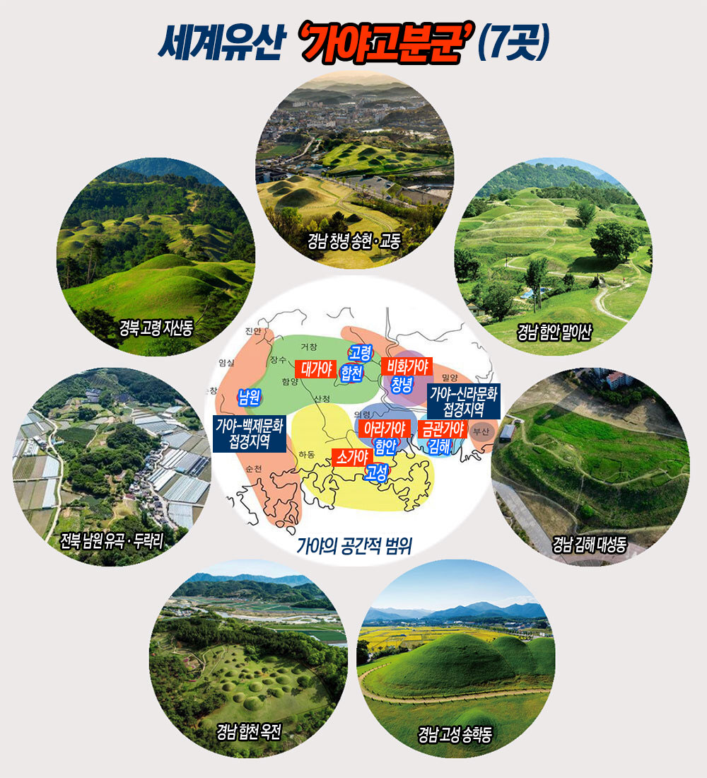 이번에 유네스코 세계유산으로 등재된 가야고분군은 우리나라 남부 지방에 있는 김해 대성동고분군, 함안 말이산고분군, 합천 옥전고분군, 고령 지산동고분군, 고성 송학동고분군, 창녕 교동과 송현동고분군, 남원 유곡리와 두락리고분군 등 7개 유산으로 구성된 연속유산이다. [자세한 내용은 ‘가야고분군추진단’ 참조]