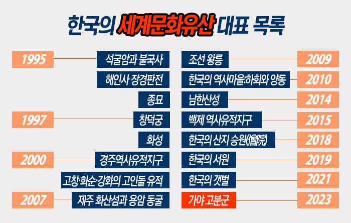 1995년 ‘석굴암과 불국사’로 처음 유네스코 세계유산으로 등재된 이래, 2021년에는 ‘한국의 갯벌’이 열다섯 번째 세계유산이 되었다. 이번 유네스코의 결정으로 가야고분군은 우리나라의 열여섯 번째 세계유산목록에 이름을 올리게 되었다. [관련 글 : ‘한국 갯벌’ 15번째 세계유산으로 등재]
