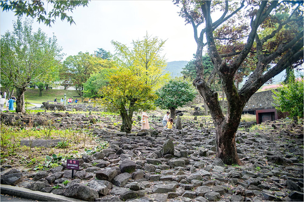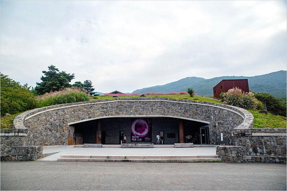 미술관 왼쪽으로 사면에 펼쳐진 너덜겅(돌이 많이 흩어져 있는 비탈)은 암석정원이라는 이름이 붙었고, 그 오른쪽 그러니까 미술관 지붕 위는 하늘정원으로 핑크뮬리가 화사하게 피어 있었다. 미술관 오른쪽에 야영장, 그 위로는 돌담길이 이어졌다.