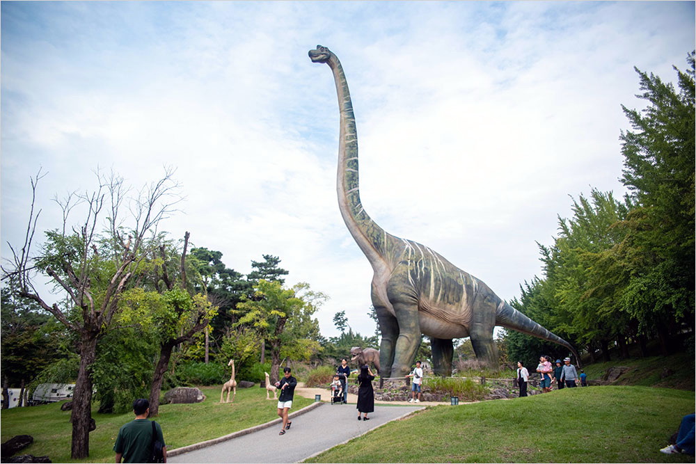 다시 공원 위쪽으로 오르니, 왼쪽은 몸길이 42m 브라키오사우루스, 티라노사우루스, 트리케라톱스, 파키케팔로사우루스 등 움직이는 초대형 공룡들과 화석 발굴 체험장이 있는 공룡뜰이다. 어린이들을 위한 테마공원으로 거대한 규모의 공룡은 만듦새가 조악하지 않고 썩 그럴듯했다.