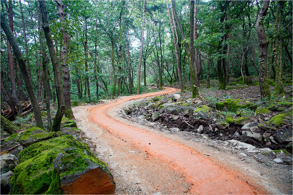 굵은 모래(마사토)를 깐 여는 길과는 분명히 차이가 나는 그야말로 진국의 ‘황톳길’이다. 아이들은 구경을 이어가고 우리 내외는 주저하지 않고 신발을 벗었다. 누렇고 고운 입자의 진흙이 길의 중앙에 두툼하게 쌓였는데, 간밤의 비를 머금어 촉촉한 그 느낌이 아주 좋았다. 코스는 3km와 1km, 두 종륜데 우리는 짧은 길을 택했다. 짧은 코스를 선택하는 바람에 유명한 이끼 정원은 만나지 못했다.