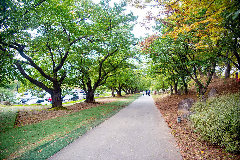 성벽 모양으로 세운 담장 가운데 성문처럼 뚫린 문을 지나 입장권을 확인하고 들어가는데, 눈앞에 전개되는 메타세쿼이아 숲이 예사롭지 않았다. 비자나무가 2열로 서 있는 언덕 아래 주차장에 차를 대고 나오자, 공원으로 오르는 길은 벚꽃길, 좌우에 45년이 넘은 벚나무 고목이 넘실대며 이어졌다.
