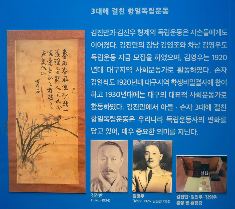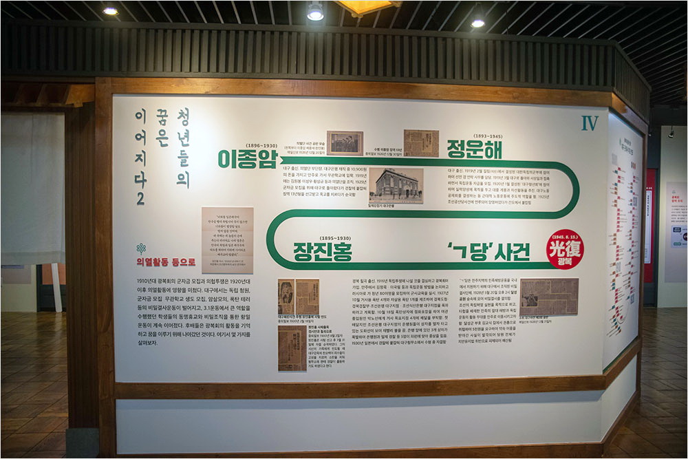 2층에서는 기획전인 대구 지역 독립운동사 돋보기 전시로 ‘대구에서 만나자-1910년대 광복을 꿈꾼 청년들’이 열리고 있었다. 1층의 ‘구국의 정신’의 각론이라고 볼 수도 있는 전시는 매우 폭넓고 구체적인 형식이었다. 의열단의 이종암(1896~1930, 독립장), 조선공산당의 정운해(1893~1945, 애국장), 광복회의 장진홍(1895~1930, 독립장), 박상진(1884~1921, 독립장) 의사, 김진만(1876~1934, 독립장)·김영우(1895~1926, 애족장)·김일식(1912~1953) 등 3대에 걸친 항일독립운동도 상세하고 다루고 있었다.