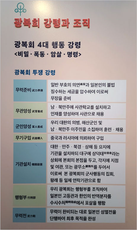 특히 1910년대 대구 달성공원에서 결성된 ‘광복회’ 활동에 주목하여 조직과 강령, 연락기관, 경북 우편마차 사건과 경찰을 감시한 ‘상덕태(尙德泰)상회’ 등을 상세하게 다루었다. 지난 6월 9일 전시를 개막한 후 8월 15일 광복절에 관람객 1만 명을 돌파한 데 이어, 개천절인 10월 3일에 누적 관람객 2만 명을 넘었다고 한다.