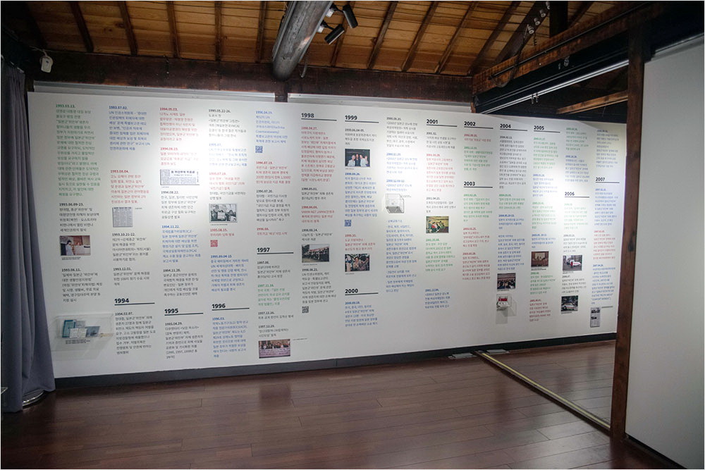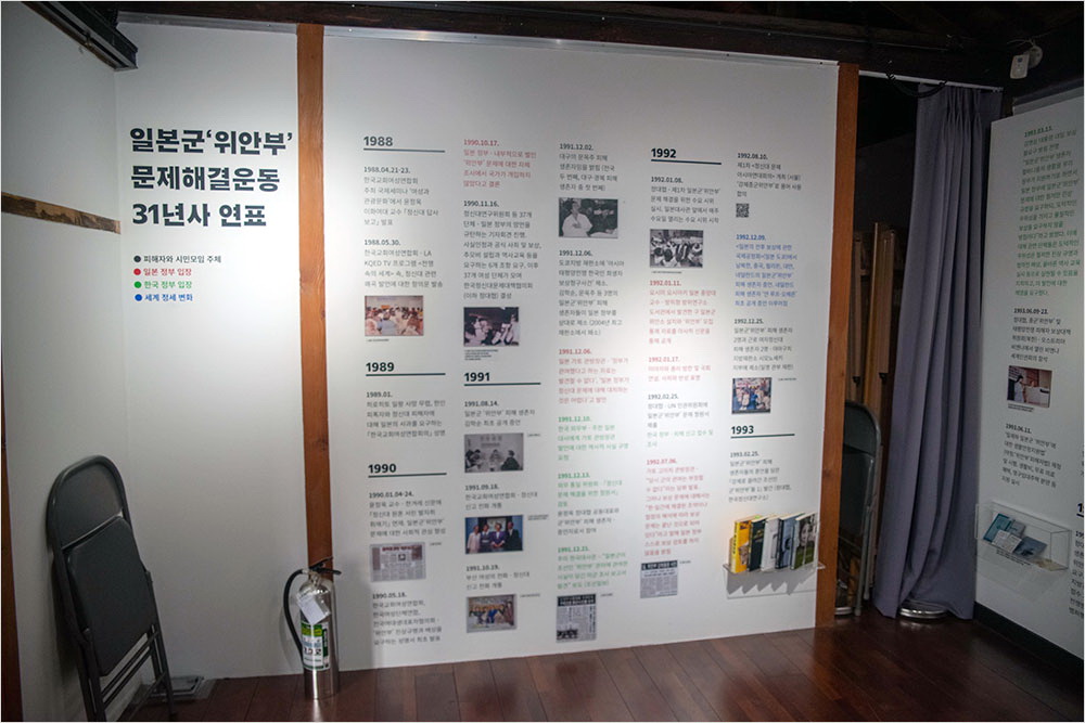 재건축한 건물이지만, 내부 공간은 비좁았다. 설마 접수대 뒤편이 상설 전시장일 줄이야. ‘위안부’ 피해자들의 흑백과 컬러사진이 빽빽하게 걸린 좁은 계단을 오르면 2층 전시실이었다. 벽면 두 개에 걸쳐 일본군 ‘위안부’ 문제 해결 운동 31년사 연표가, 그 뒤쪽 교육관에는 대구·경북 지역 일본군 ‘위안부’ 할머니들의 사진과 이야기, 유품이 전시되어 있었다.