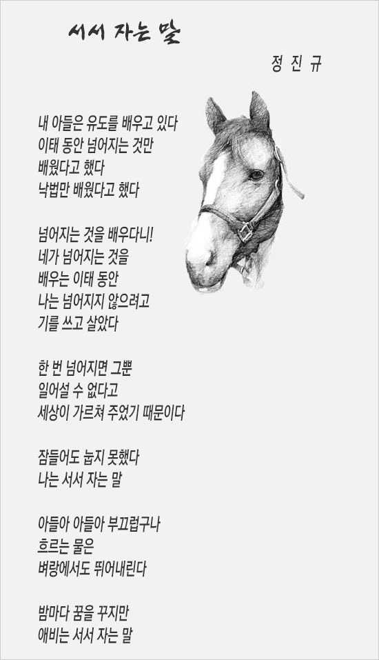 거기 세월 속에 명멸했던 우리들 삶과 세대의 순환 앞에 나의 초상이 있다. 선친께서 그랬던 것처럼, 여전히 우리는 ‘서서 자는 말’이다. 고통과 두려움을 넘어 아이들이 어른이 되듯, 우리는 아들의 아비가 되고, 다시 왜소하고 무력한 존재로 스러지려 한다.