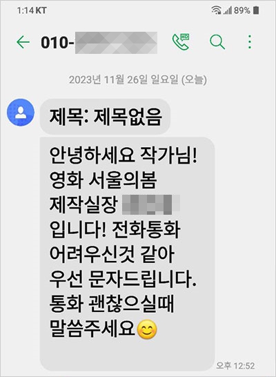 이틀 후 정오께 걸려 온 낯선 번호의 전화를 나는 받지 않았는데, 뒤이어 날아온 문자를 보고 바로 전화를 걸었다. <서울의 봄> 제작실장이라는 여자분이었다. 나는 약간 흥분해서 반갑다고, 축하한다고, “이 역사적인 영화와 잠깐이라도 연을 맺었다는 사실만으로도 행복하고 기쁘다”라고 말했다.