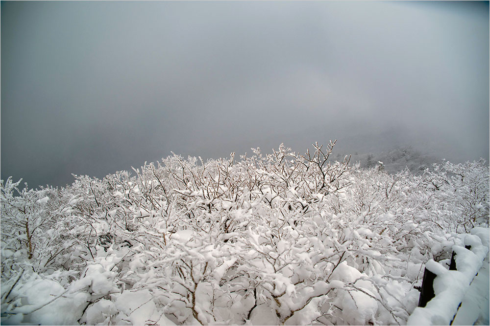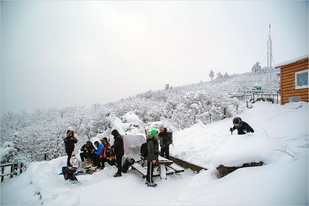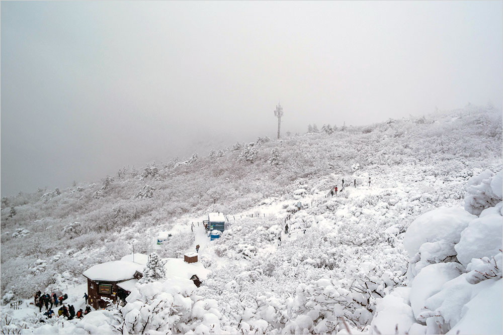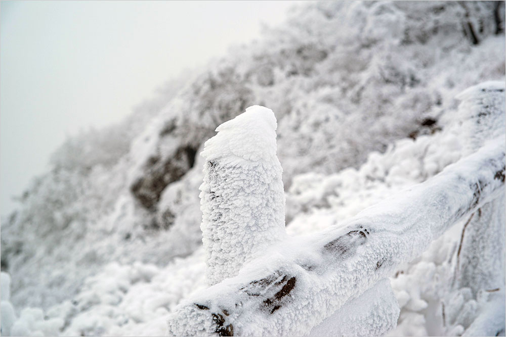 기온은 영하 14도. 칼바람 속에 귀마개를 꺼내 쓰고, 재킷에 달린 모자를 여며 쓰고, 곤돌라 오른 지 20여 분 만에 설천봉(1,520m)에 닿았다. 널찍한 평지에 쉼터와 저만치 하얗게 눈을 맞은 팔각정 상제루(上帝樓가 언 채로 서 있었다. 주변은 눈 천지다. 땅은 물론, 나무와 가지, 울타리와 눈이 쌓일 수 있는 면마다 눈이 하얗게 쌓여 있었다.