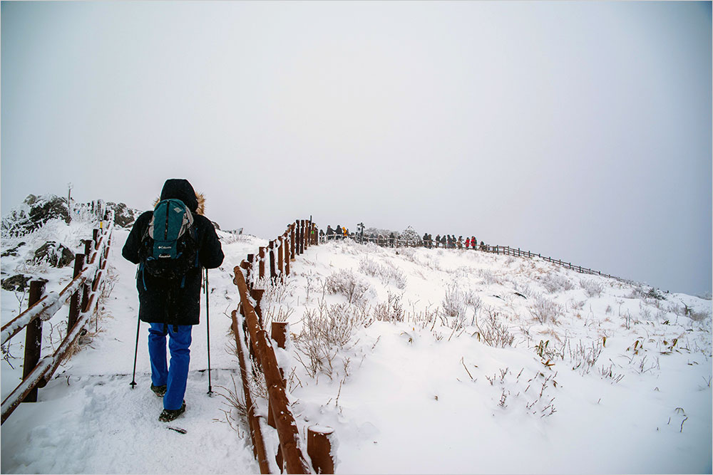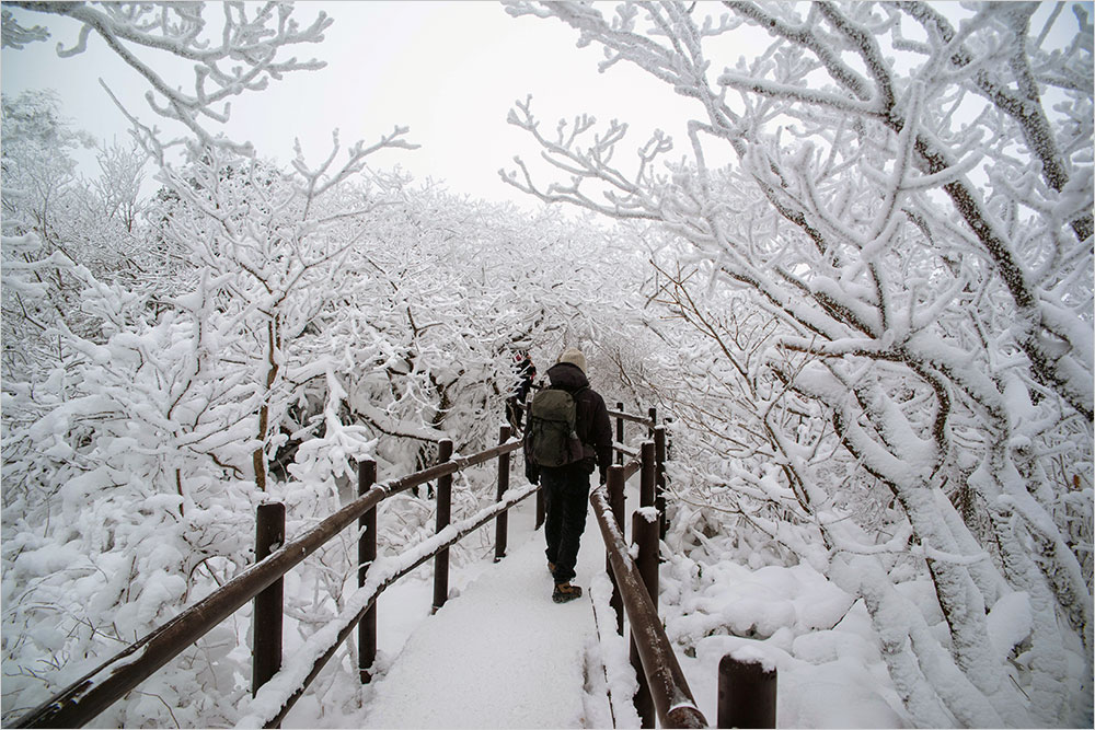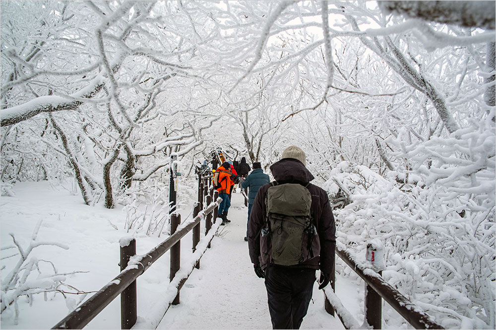 쇠와 합성목재로 만든 덱(deck) 계단 길로 들어섰다. 길 좌우에 눈꽃을 피운 나뭇가지와 두껍게 눈옷을 입은 나무줄기 사이로 펼쳐지는 풍경은 하나같이 비슷했지만, 나는 망설이지 않고 셔터를 눌러댔다. 좁은 길을 오르내리는 인파들로 앞으로 나아가는 것조차 가끔 막히곤 하니 이것저것 살피다가는 촬영은 쉽지 않을 듯해서다.