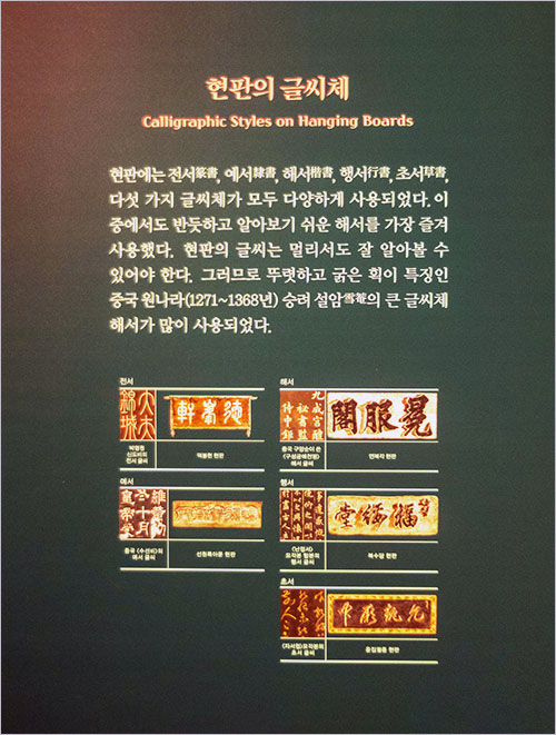 현판의 글씨체는 전서, 예서, 해서, 행서, 초서 총 다섯 가지 서체가 사용되었다. 그중 멀리서도 잘 알아볼 수 있는 반듯한 글꼴의 해서(楷書)가 대다수를 차지한다. 대체로 한자에 밝지 못한 사람들에게 가장 괴로운 서체가 초서다. 엔간한 수련이 없이는 한 자도 제대로 읽을 수 없기 때문이다.