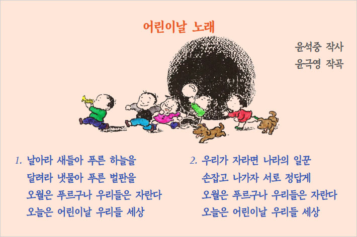 기념일 노래로는 ‘어린이날 노래’ 말고도 ‘스승의 날’(‘스승의 은혜’와는 다른 노래), 그리고 ‘빛나는 졸업장을 타신 언니께 / 꽃다발을 한아름 선사합니다’로 시작하는 ‘졸업식 노래’도 그의 작품이다. 어린이날을 앞두고 나는 어린이날 노래의 노랫말을 가만가만 뇌어 본다.
