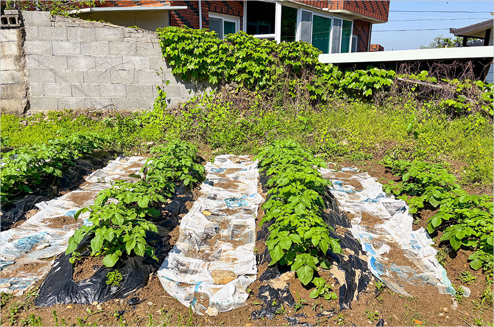 감자도 제법 잎이 무성해지고, 고추도 뿌리를 제대로 내렸는지, 일단 기운 차 보였다. 고랑에 풀이 슬슬 꾀는 듯해서, 풀을 매고 가져간 신문지를 깔았다. 지난번 감자 농사를 지을 때 누군가에게서 얻어들은 지혜다. 아직 풀이 짖을 때가 아니니 신문지를 깔아놓는 것만으로도 충분하다고 해서다.