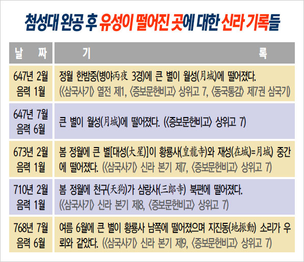 첨성대가 천문대였다는 더 직접적이고 확실한 증거는 첨성대가 만들어진 이후, 다섯 군데 유성이 떨어진 위치들을 서술하고 있는 <삼국사기>와 <삼국유사>, <증보문헌비고> 등에 실린 고대 천문관측 기록에 있다. 한국천문연구원 김봉규 박사의 분석과 주장이다.