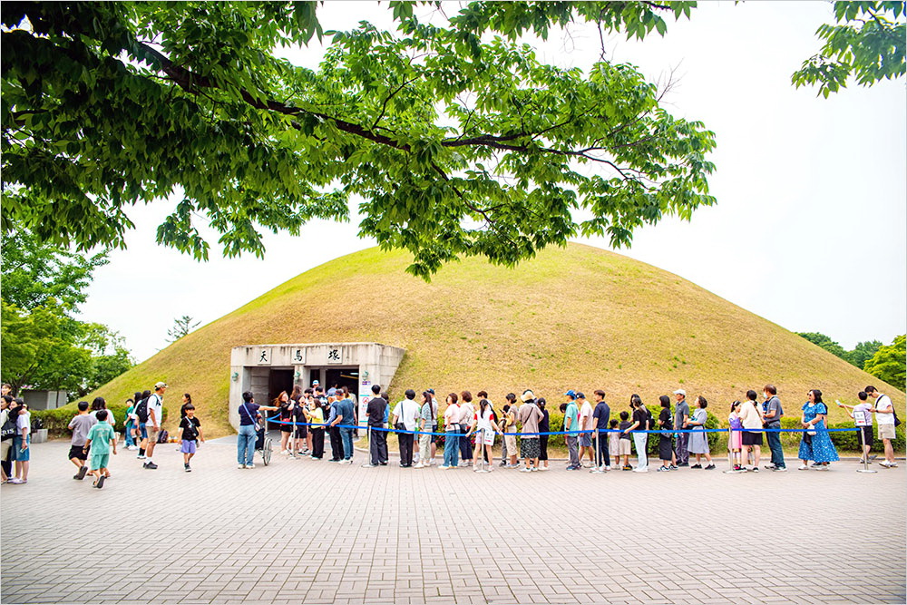 발굴 당시 천마총의 봉분은 화산분화구처럼 움푹 들어가 봉분에 흙을 채워 봉긋하게 복원하였고, 무덤 형태를 알 수 있게 유리전시관 안의 썩은 목관은 그대로 둔 채 덧널만을 복원해 목관 내부를 볼 수 있게 공개하고 있다. 우리의 동선 끝에서 만난 천마총에는 입장을 기다리는 사람이 줄이 기다랗게 늘어졌는데, 대기 시간만 30분이어서 우리는 발길을 돌렸다.