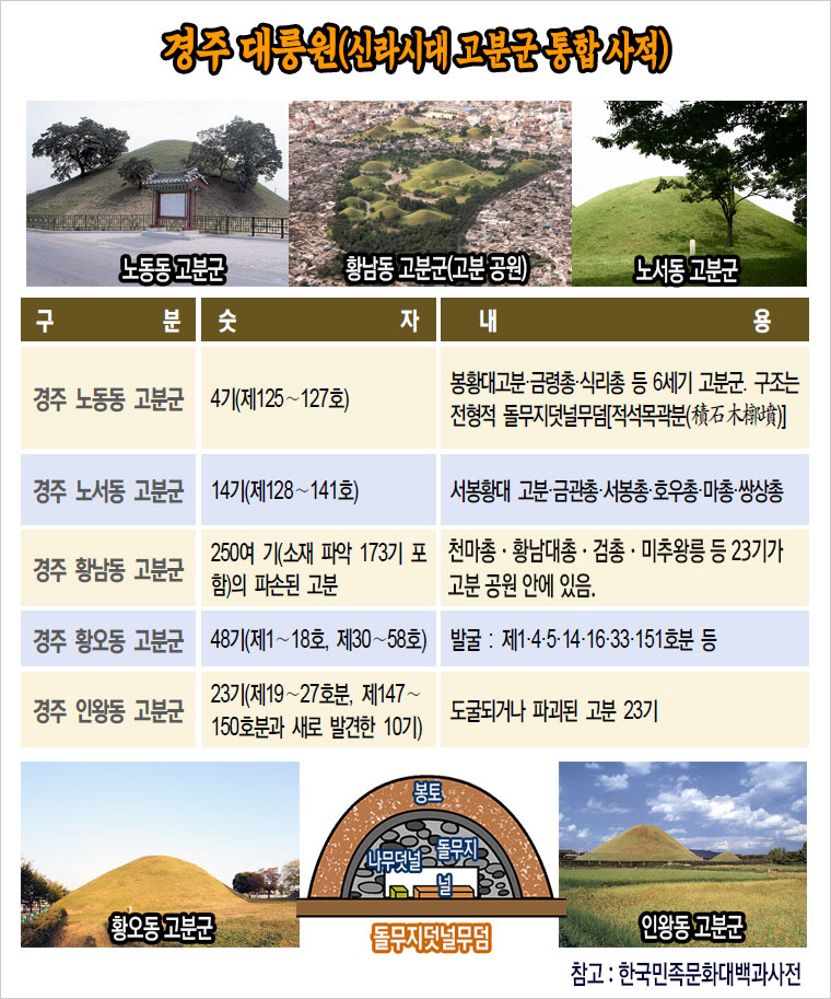 2011년 사적으로 지정된 경주 대릉원은 본래 1963년 사적으로 지정된 경주노동리고분군, 경주노서리고분군, 경주황남리고분군, 경주황오리고분군, 경주인왕리고분군으로 분리되어 있었다. 그런데 2011년 국가유산청이 유적의 특성과 역사성을 고려하여 경주평야 한복판에 인접해 있는 신라시대의 고분군을 통합하고 사적으로 재지정한 것이다.