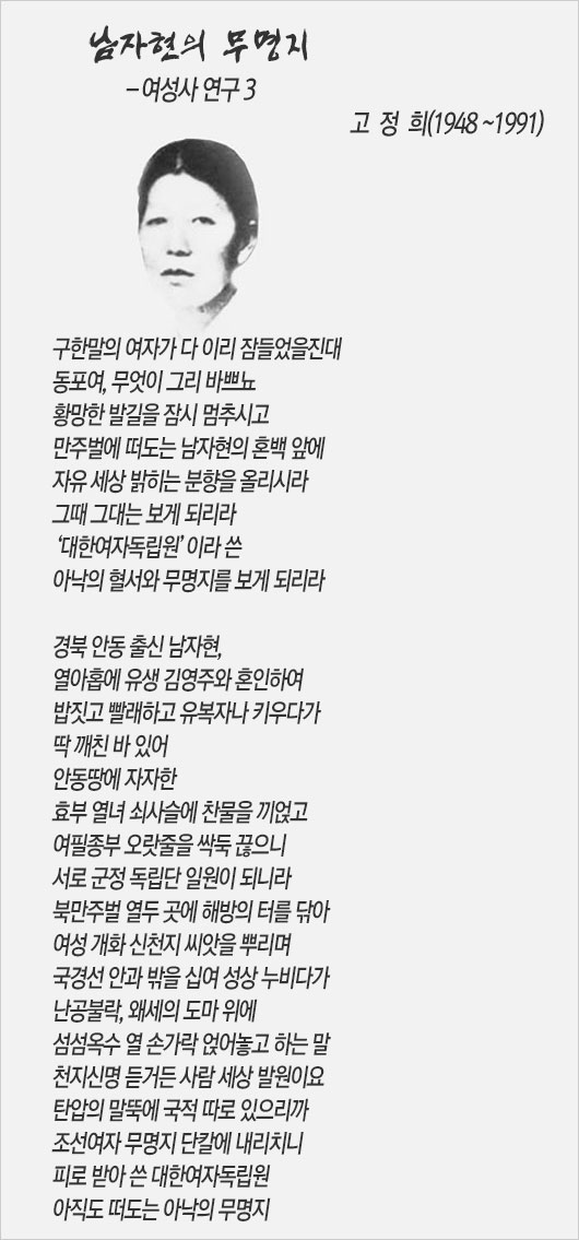 남편을 잃고 47살의 나이에 만주로 떠난 남자현은 ‘독립군의 어머니’였다. 그의 ‘단지(斷指) 혈서 투쟁’은 유명하다. 1920년대 만주 독립운동단체의 통합운동이 부진하자 선생은 분연히 일어나 혈서를 쓴다. 남자현이 손가락을 베어 그 피로 글을 써서 책임자들을 소집하자 간부들은 스스로 부끄러워하였다고 한다.