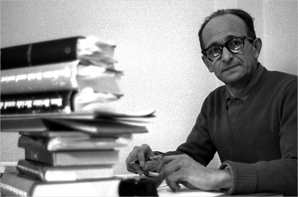 수백만 명을 기아와 파멸 그리고 죽음으로 몰고 간 홀로코스트 주역 아이히만은 물 한 잔과 공책, 필기구가 놓인 방탄유리로 제작한 피고인석에 섰다. 그러나 나치 사냥꾼 지몬 비젠탈(Simon Wiesenthal)은 그를 “싸구려 검은 정장을 입은 허약하고 창백하며 누추한 존재이자 공허한 그림 속에 그려져 있는 2차원의 비현실적인 형상인 듯했다.”라고 묘사했다.