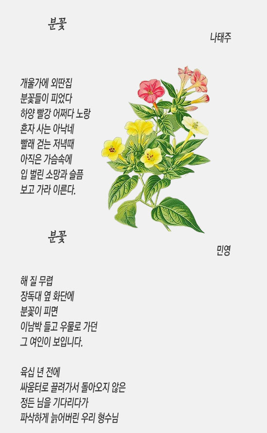 분꽃은 빨갛고 노랗게, 그리고 하얗게 피는 꽃에 그치지만, 그것은 시인의 눈물과 가슴에서 필연의 사랑, 북받치는 그리움으로 변주되고, 외로운 여인들의 삶의 소망과 잃어버린 희망에 대한 연민이 되어 모두의 가슴에 오롯이 다가온다. 분꽃 시편을 읽으면서, 사진 속 분꽃의 ‘화사한 비애’를 언뜻 본 듯하기도 하다.