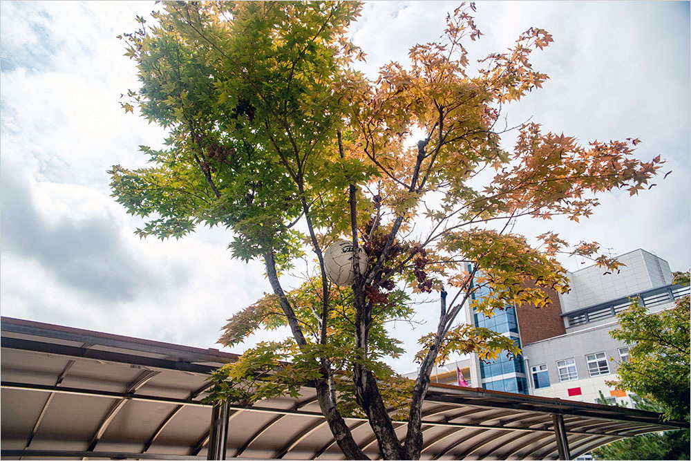 공은 운동장 가녘, 축구 골대의 그물과 느티나무 아래 벤치 근처, 철봉 부근에 흩어져 있는데, 어제는 카메라를 들고 한 바퀴 돌다가 울타리의 나뭇가지 위쪽에 박혀 있는 공을 두 개나 발견했다. 하나는 단풍나무 가지에 박힌 하얀 배구공이고, 또 하나는 느티나무 빽빽한 가지에 틀어박힌 빨간 줄무늬의 축구공이다.