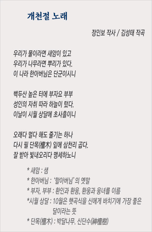 내일은 개천절, 문득 생각나서 그 노랫말을 거듭 살펴보았다. 개천절 노래는 본래 대종교에서 부르던 노래였으나 개천절을 국경일로 지정하면서 지금과 같이 바뀌었다. 정인보가 노랫말을 쓰고, ‘즐거운 우리 집’, ‘동심초’, ‘못 잊어’ 등의 가곡과 동요 ‘잘 자라 우리 아가’의 작곡가 김성태(1900~1986)가 작곡한 노래는 나라의 뿌리가 단군임을 분명히 한다.