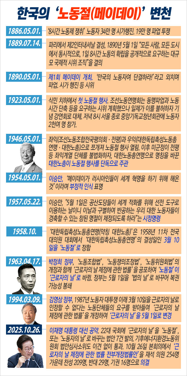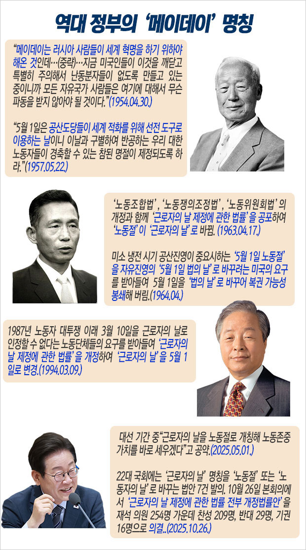 다시 30년 뒤다. 이재명 대통령은 대선 후보 시절인 올해 5월 1일 “근로자의 날을 노동절로 개칭해 노동 존중 가치를 바로 세우겠다”라고 했고, 22대 국회에는 ‘근로자의 날’ 명칭을 ‘노동절’ 또는 ‘노동자의 날’로 바꾸는 법안이 7건 발의됐다. 그리고 지난 10월 26일, 법안은 국회 본회의를 통과했다.