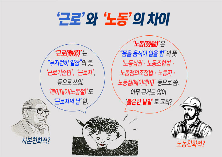 그 결과 이 땅에는 법률적으로도 두 개념이 혼용된 결과, 근로기준법이 있고, 다른 한편에는 노동관계법이 존재한다. 노동조합법이나 노동쟁의조정법 따위를 ‘근로조합’이나, ‘근로쟁의’로는 바꾸어 쓸 수 없다. 그런데도 가장 중립적이고 객관적인 뜻을 지닌 ‘노동자’ 대신 ‘근로자’나 ‘산업 일꾼’이 선택되어 쓰이다 보니, 만국 공통의 노동절(메이데이)도 이 땅에서는 ‘근로자의 날’이 되기에 이르렀다. [관련 글 : 노동 2제(題) - 불온한 시대, 불온한 언어]