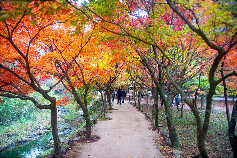 그럼, ‘단풍’은 어땠나, ‘때’는 맞추었던가. 주차장 쪽에서 탐방안내소로 오르는 길 좌우에 빽빽하게 들어찬 단풍나무는 옷을 반만 갈아입은 듯했다. 흔히 ‘아기단풍’으로 불리는 내장산 고유의 잎사귀가 작은 ‘당단풍(唐丹楓)’의 아름다움은 여전했지만, 아직 초록을 벗지 못한 나무들은 여전히 여름을 나지 못한 채 싱그러움을 뿜어내고 있었다.