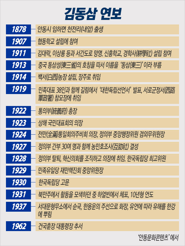 김동삼의 본관은 의성, 본명은 긍식(肯植), 호는 일송이다. 이름을 ‘동삼’으로 쓰게 된 것은 중국 망명 후 동삼성(東三省)의 호칭을 따면서부터다. 동생은 동만(東滿). 그는 안동시 임하면 천전리, 내앞마을 출신이다.